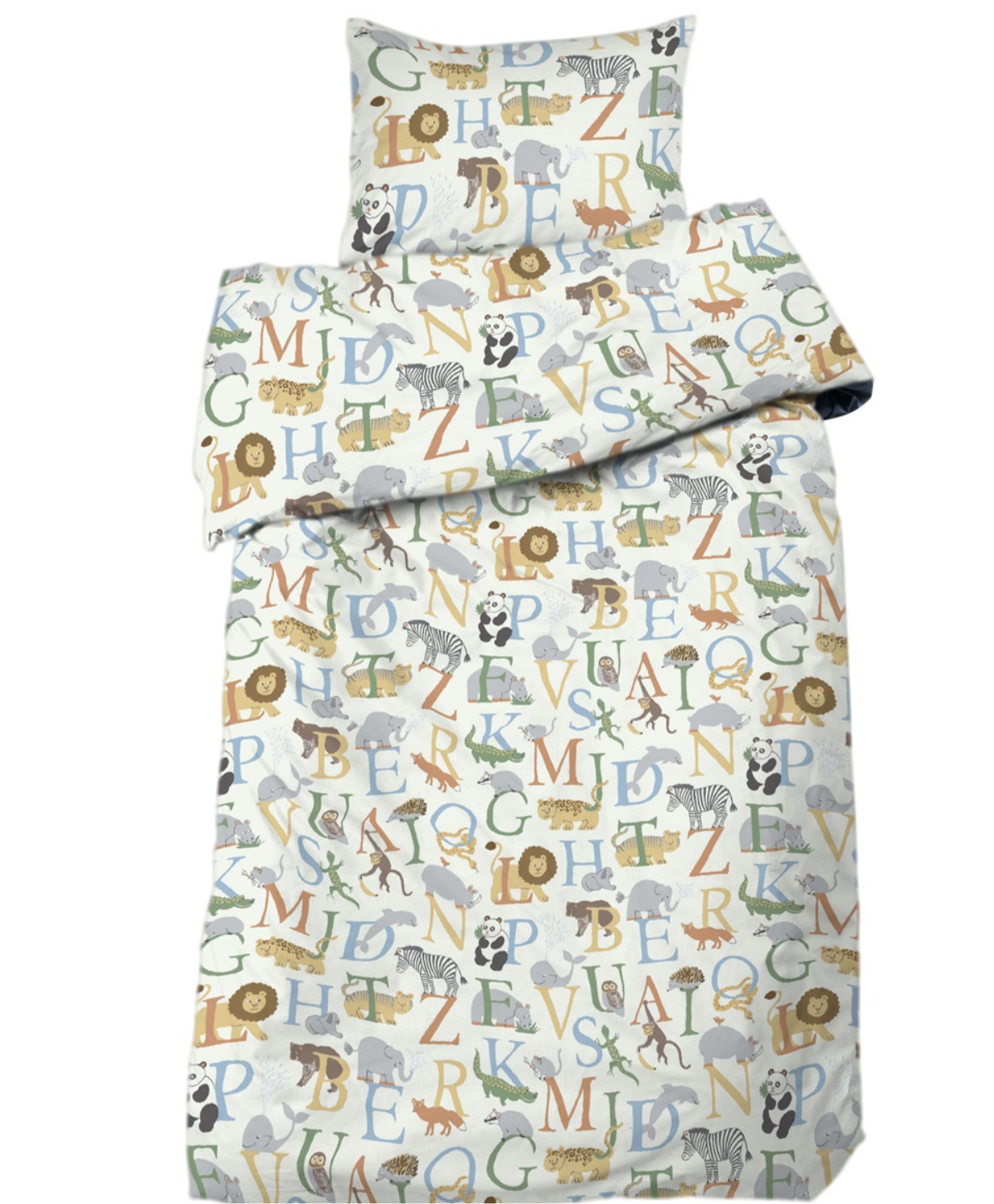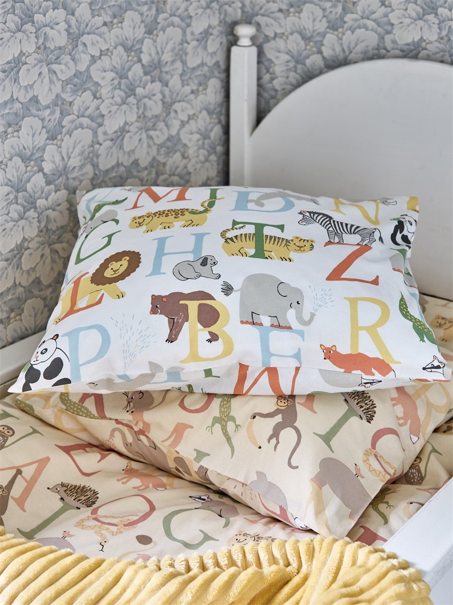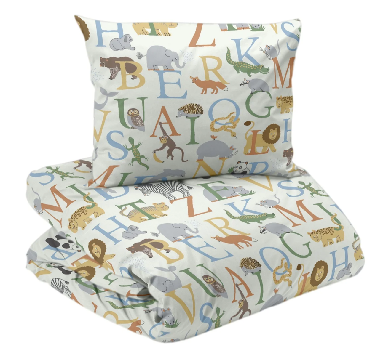 Beskrivning | Bäddset med bokstäver och tillhörande djur. 100% bomull, Oeko-tex och trådtäthet 104. Mönster skapat av svensk designer. |