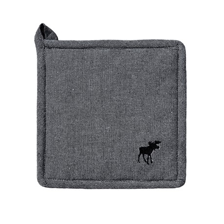 Vår charmiga grytlapp Helge har silhuetten av en svart älg broderad på tyget. Den är tillverkad i 99 procent återvunnen textil, med strävan efter att ha så lite negativ miljöpåverkan som möjligt. På så sätt kan du göra fint hemma, samtidigt som du värnar om både människor och natur. I serien Helge finns även ett kuddfodral med samma, dekorativa mönster.