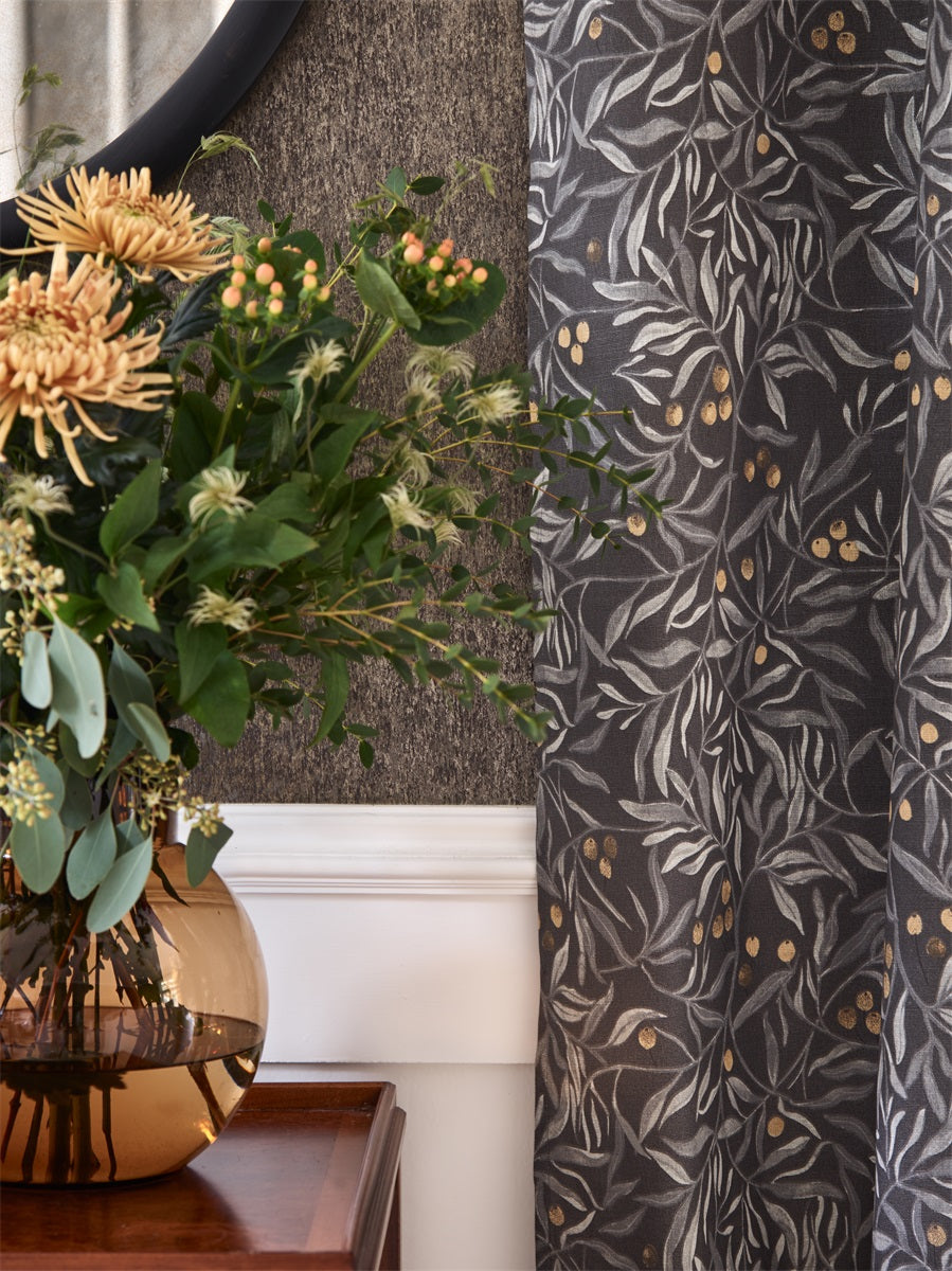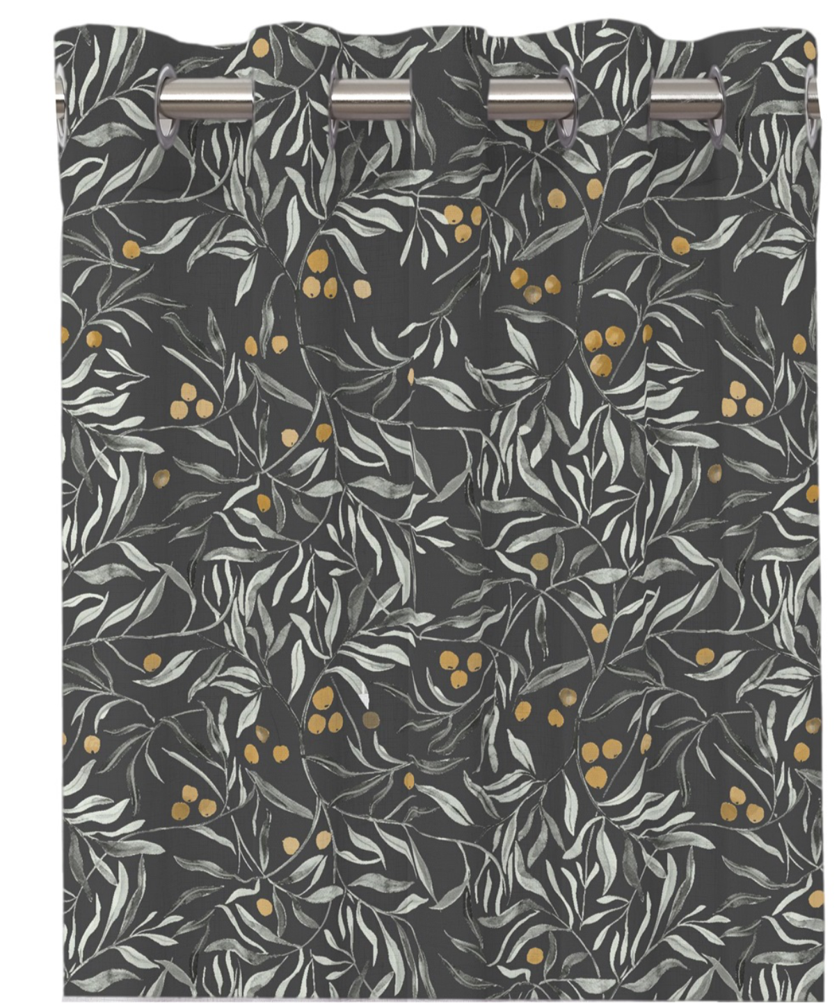 Beskrivning | Färdigsydda öljettlängder med vackert lövmönster skapat av svensk designer. |
