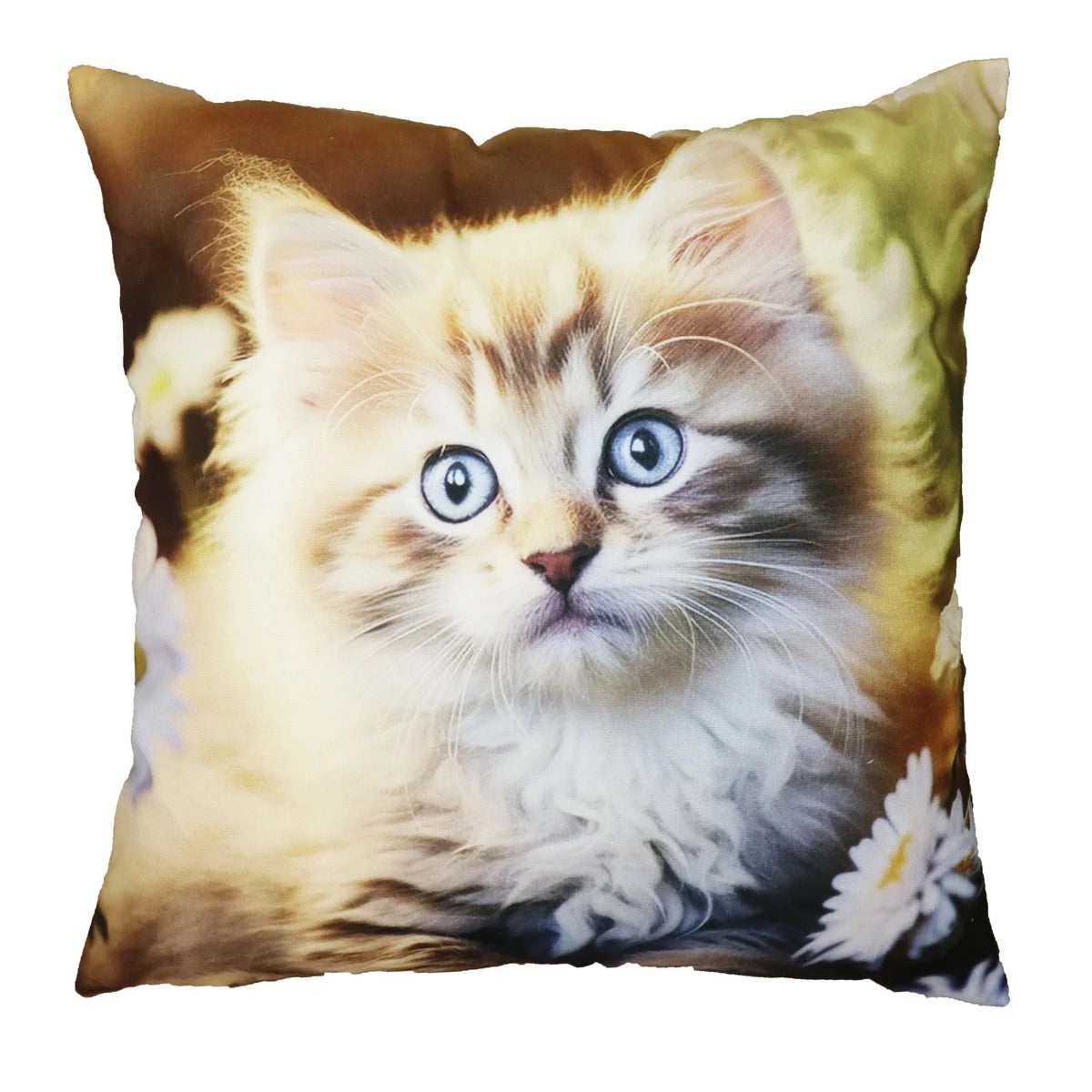 Beskrivning | Digitaltryckt kuddfodral i sammet med gullig kattunge. Tryckt på båda sidor, dold dragkedja nertill. |