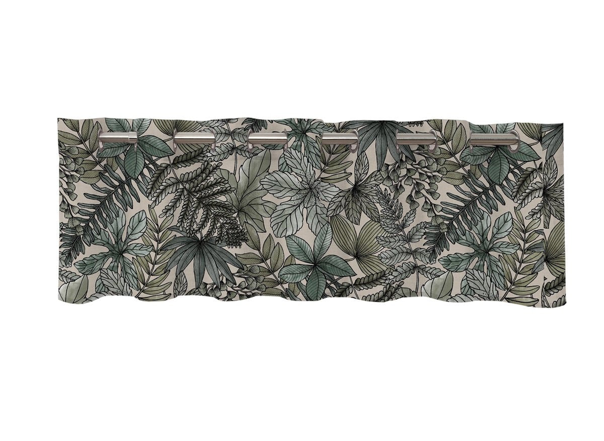 Beskrivning | Färdigsydd öljettkappa i light slub kvalité med vackert lövmönster skapat av svensk designer. |